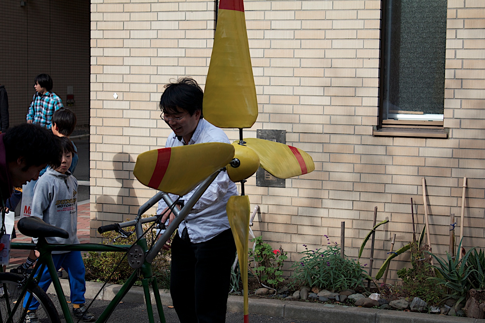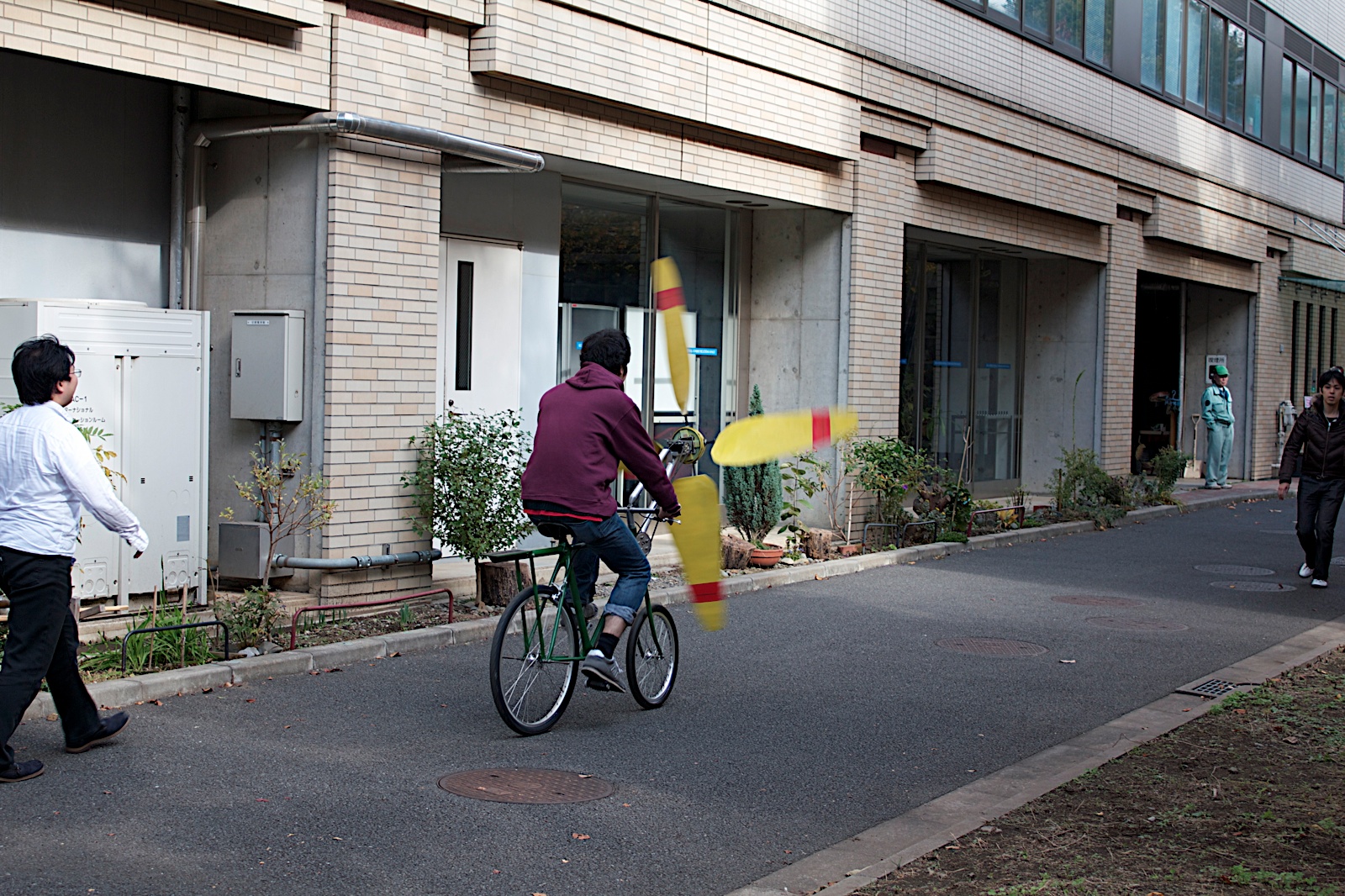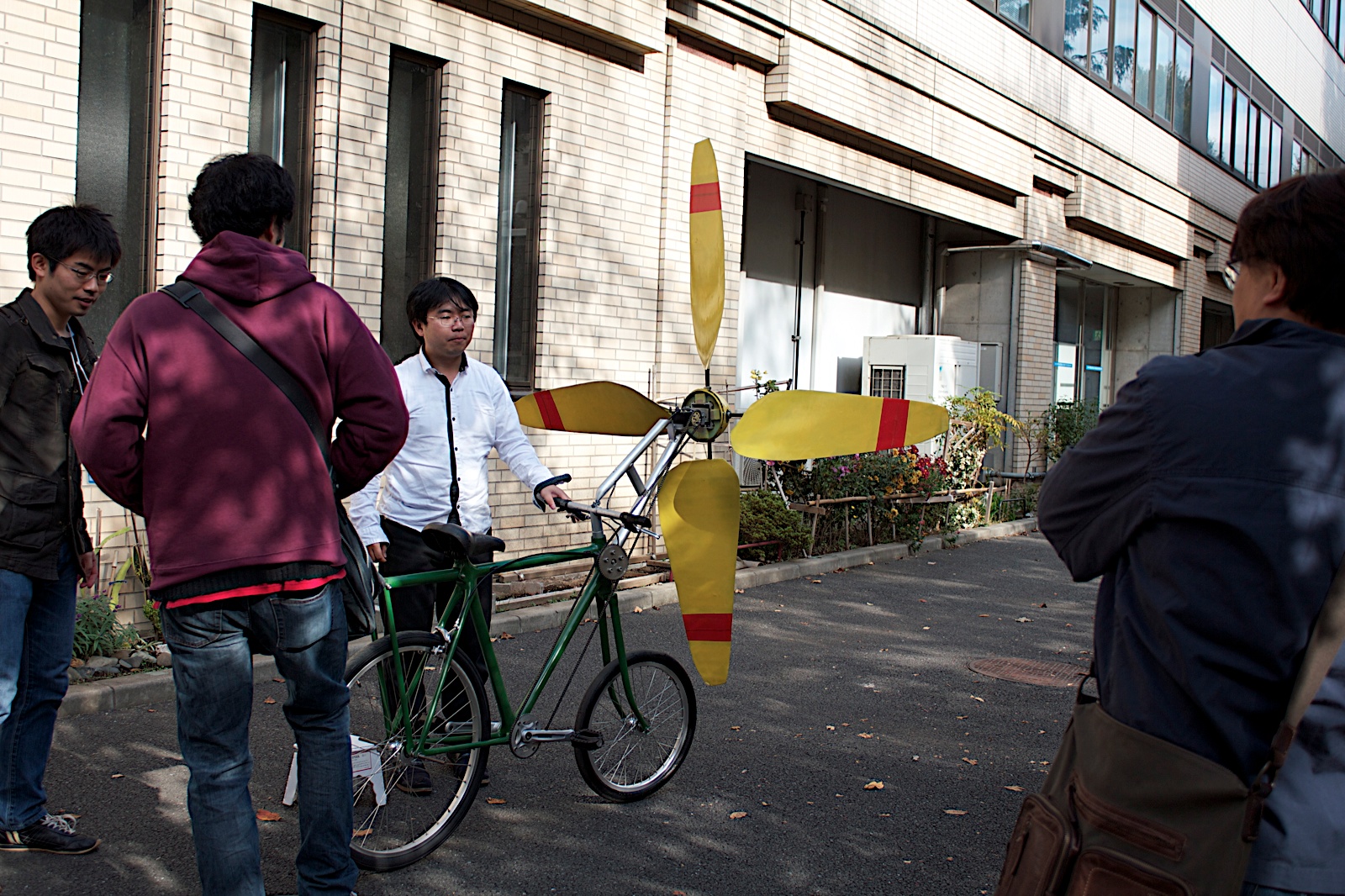 外では、プロペラを付けた自転車の試乗が行われていました。