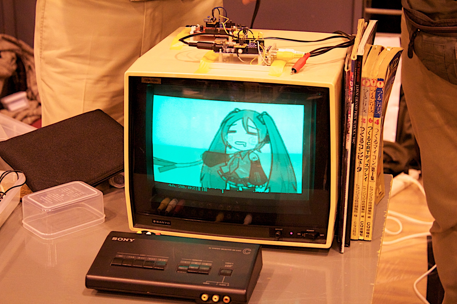 | 人形の肩に載せられたカメラの映像が隣のモニタに映し出されている |
